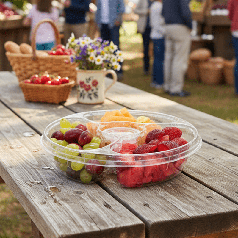 Sell an arrangement of fresh fruit, vegetables, cheese, deli meat cubes, nuts, candies, and more with this 10″ clear round 4 compartment tray with lid. This PET plastic tray includes four compartments, including four quarter circle compartments around the exterior and one circular middle section. This partitioned container is great for dividing a variety of foods without the threat of cross-contamination.