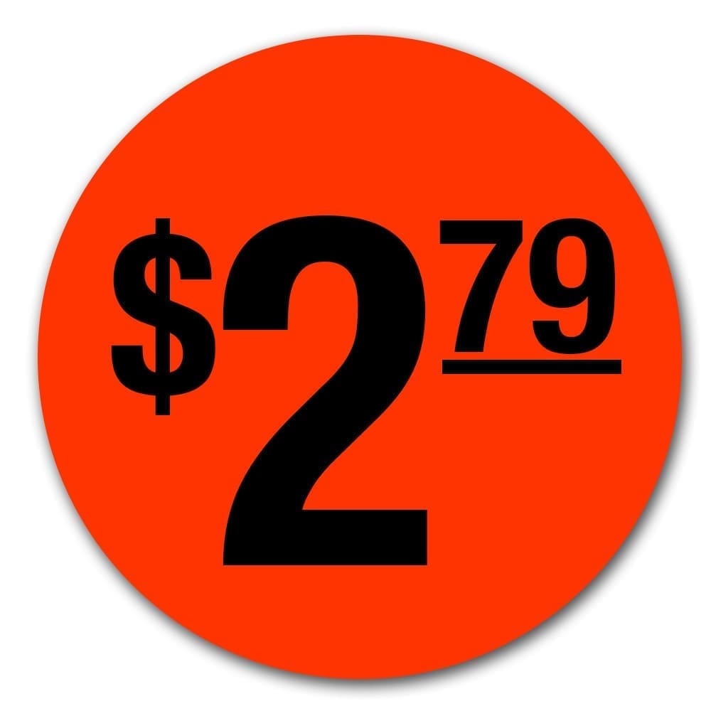 Ensure clear and consistent pricing with these convenient $2.79 Pricing Labels! Measuring 1.5″ and featuring bold black print on a bright red background, these labels effectively highlight the price point of your products, potentially increasing sales by grabbing customer attention.