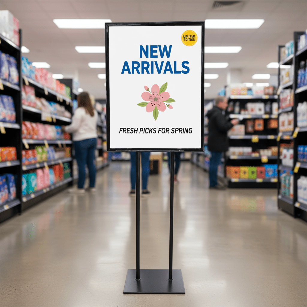 This floor stand is a great way to lead customers to specials once they are in the store! It measures 22″ x 28″ x 60″ tall and holds standard size poster inserts. The distinctive style features two posts for added stability and a raised, weighted rectangular base.