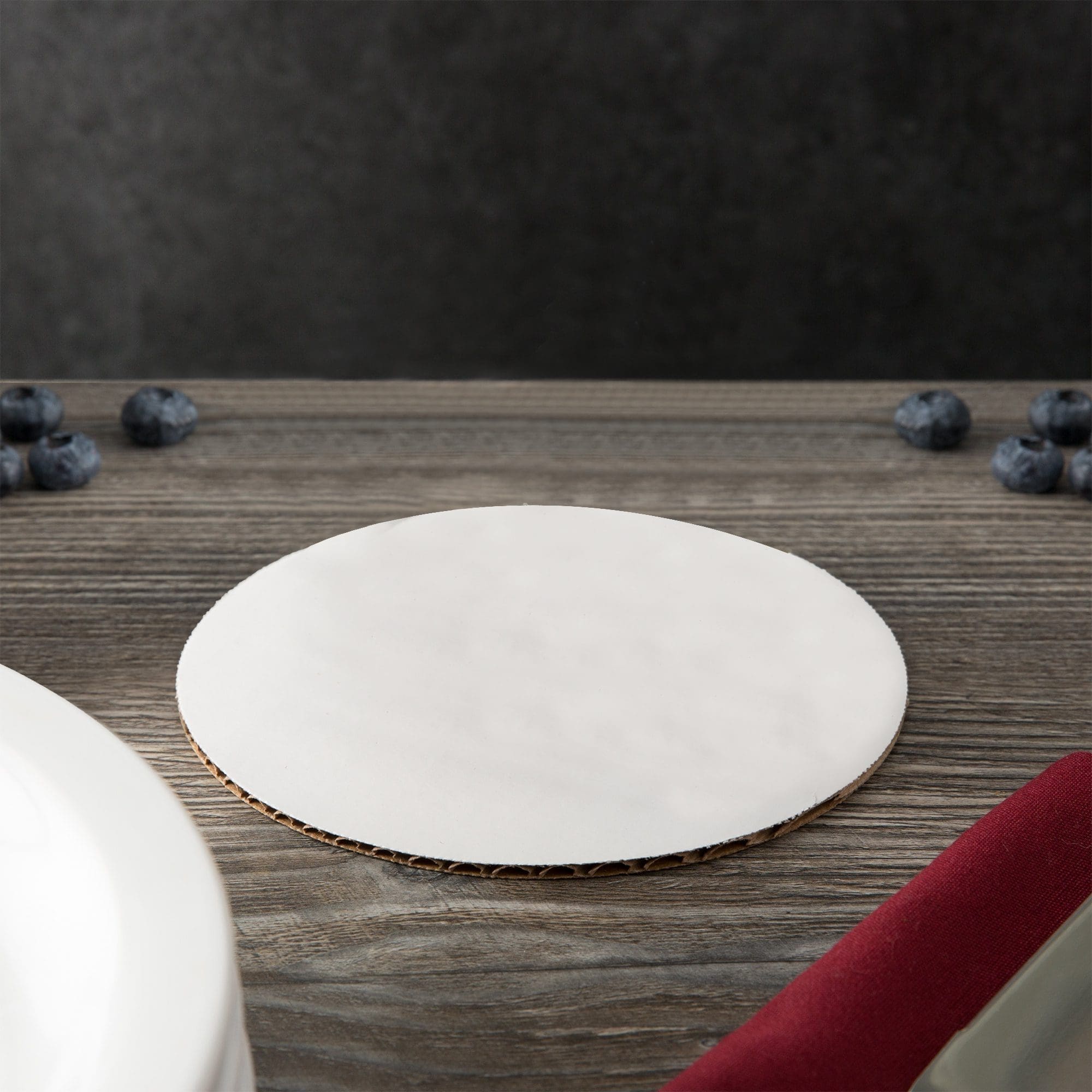 Provide a stable foundation for your cake and easily insert it in a box with this 6″ corrugated grease proof white cake circle. Made of corrugated cardboard, this durable circle supports and carries even the heaviest and most cumbersome cakes. Thanks to a waxed top, this circle does not show grease stains nor allows grease to seep into the cardboard. So no need to modify your moist cake recipe or refrain from using your signature sweet buttercream icing, this circle can handle it! With this circle, your cake continues to showcase its immaculate appearance and decoration from the first piece, through the last.