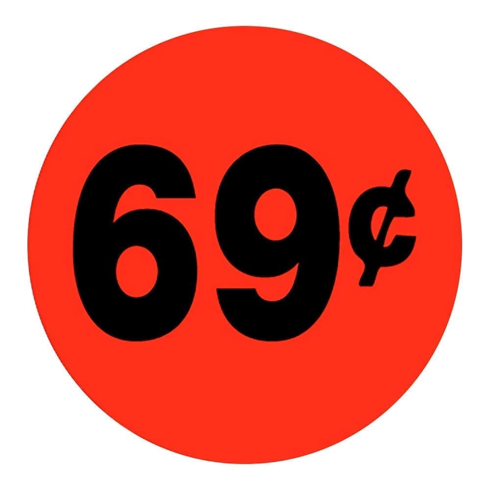Capture customer attention and promote incredible savings with these eye-catching 69 Cent Pricing Labels! Measuring 1.5″ and featuring bold black print on a bright red background, these round labels effectively advertise the rock-bottom price point of your products, potentially leading to increased sales and a significant boost in perceived value.