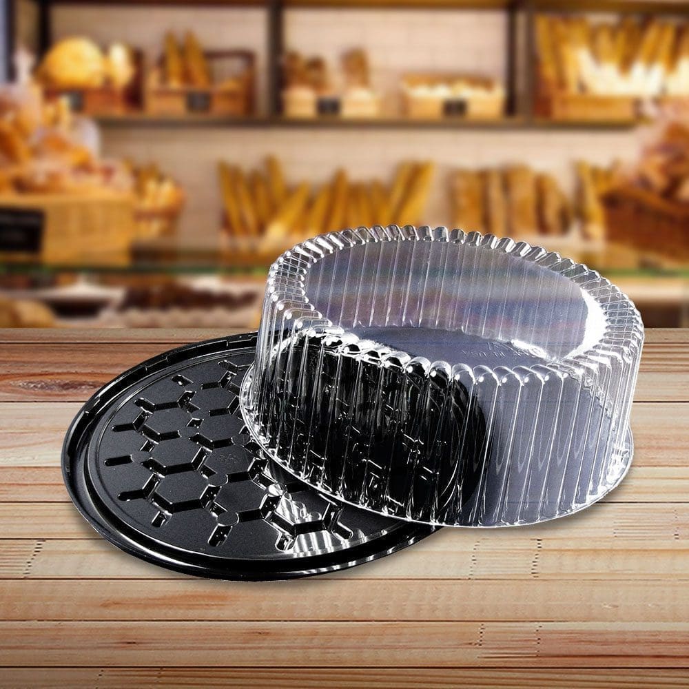 Stock your bakery with this dependable 1-2 layer cake display container! It includes a large, black tray and a secure, snap-on dome lid that’s tall enough to accommodate 1 to 2 layer cakes up to 7″ in diameter. Not only does the clear lid provide superior product visibility and fast identification, it will also help to boost impulse sales of your colorful, skillfully-crafted cakes on display.