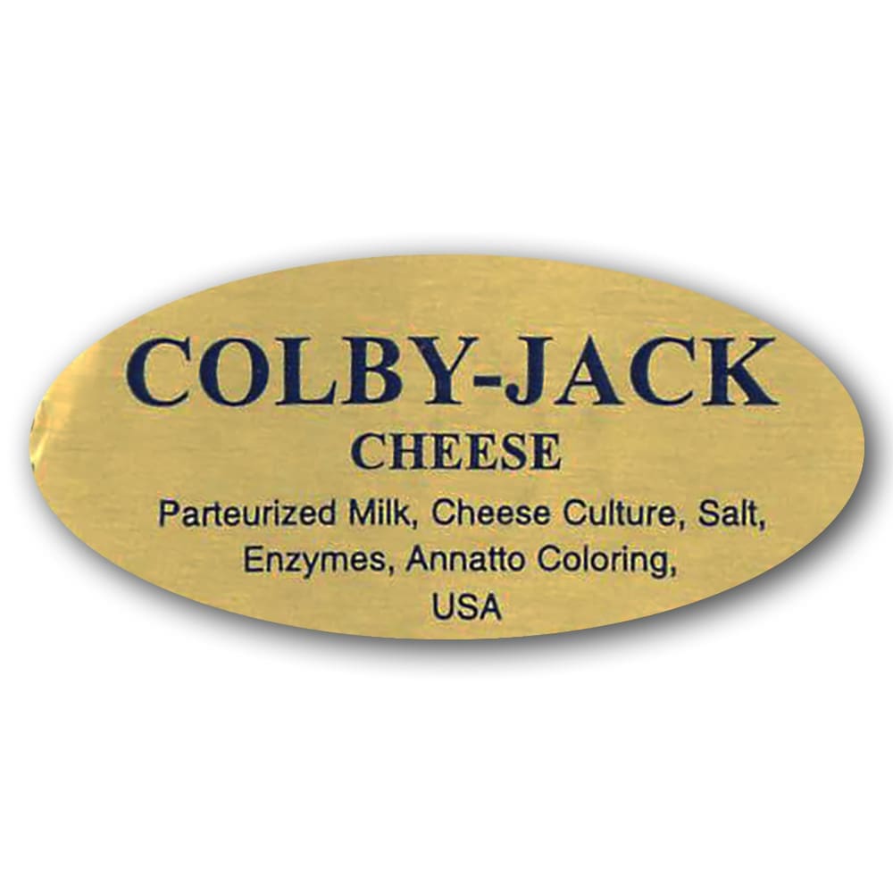 Indulge your cheese selection and enhance customer knowledge with these elegant Colby Jack Labels! Measuring 1″ x 2″ and featuring striking blue print on a shimmering gold foil background, these premium labels elevate the presentation of your cheese while providing clear product information. The prominent “Colby Jack” title instantly grabs attention, and the included “Ingredients” section below offers valuable details for discerning cheese connoisseurs.