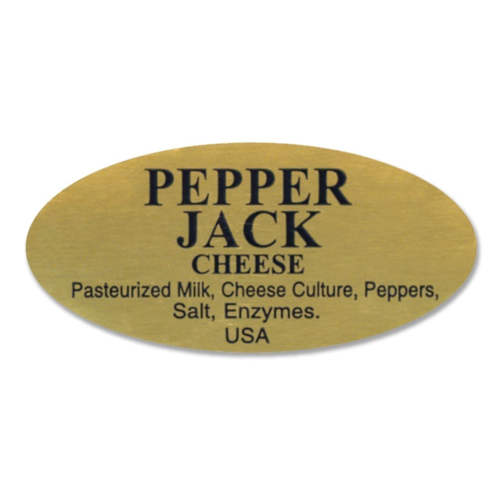 The classic blue print on a luxurious gold foil background ensures high visibility, while the clear message “Pepper Jack” and listed ingredients below identify the cheese and highlight its zesty kick.