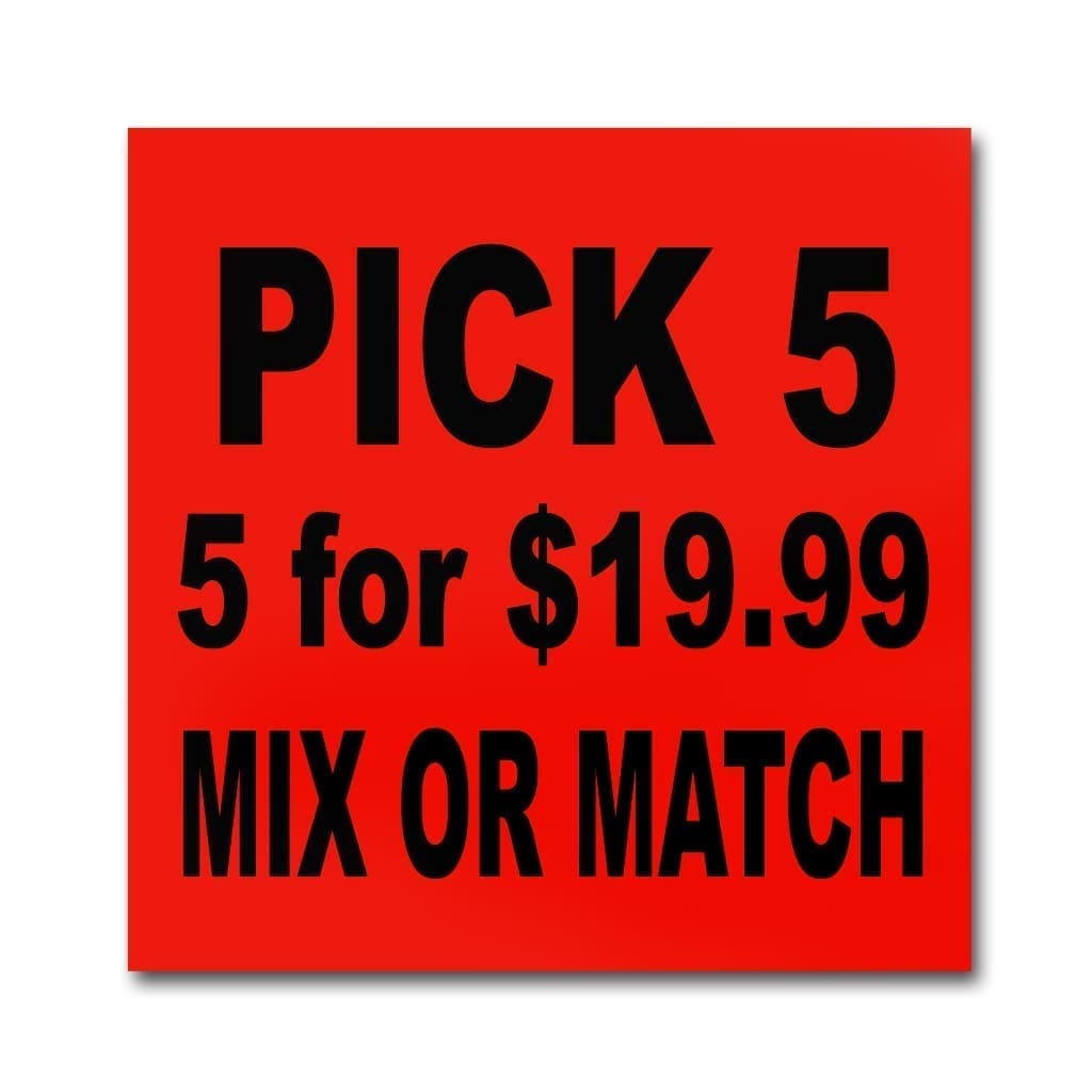 The Pick 5 for $19.99 Label is an effective tool for retailers aiming to promote bundled deals and attract customer attention. Designed with bold, eye-catching colors and clear messaging, this label is ideal for highlighting special offers in various retail environments.