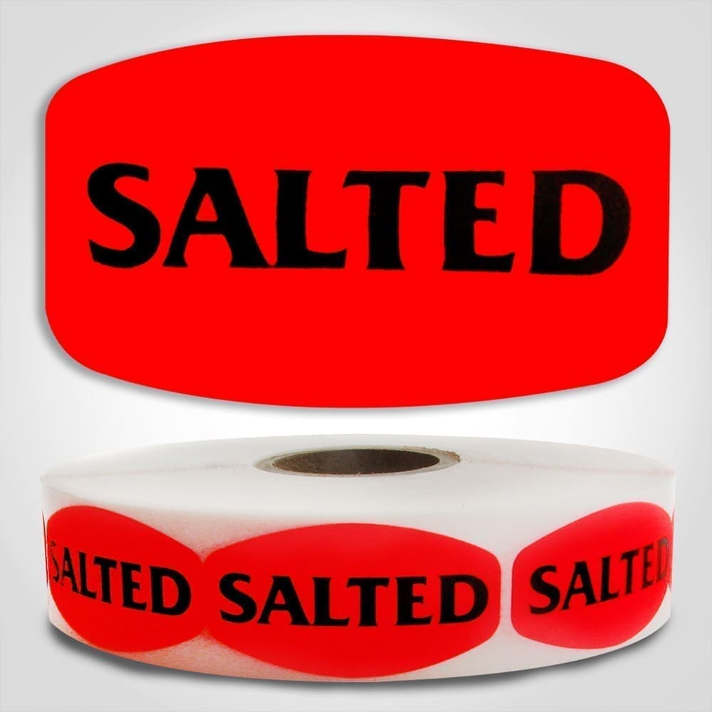 The bright red background with clear black text ensures high visibility, while the message “Salted” clearly identifies products with added salt content.