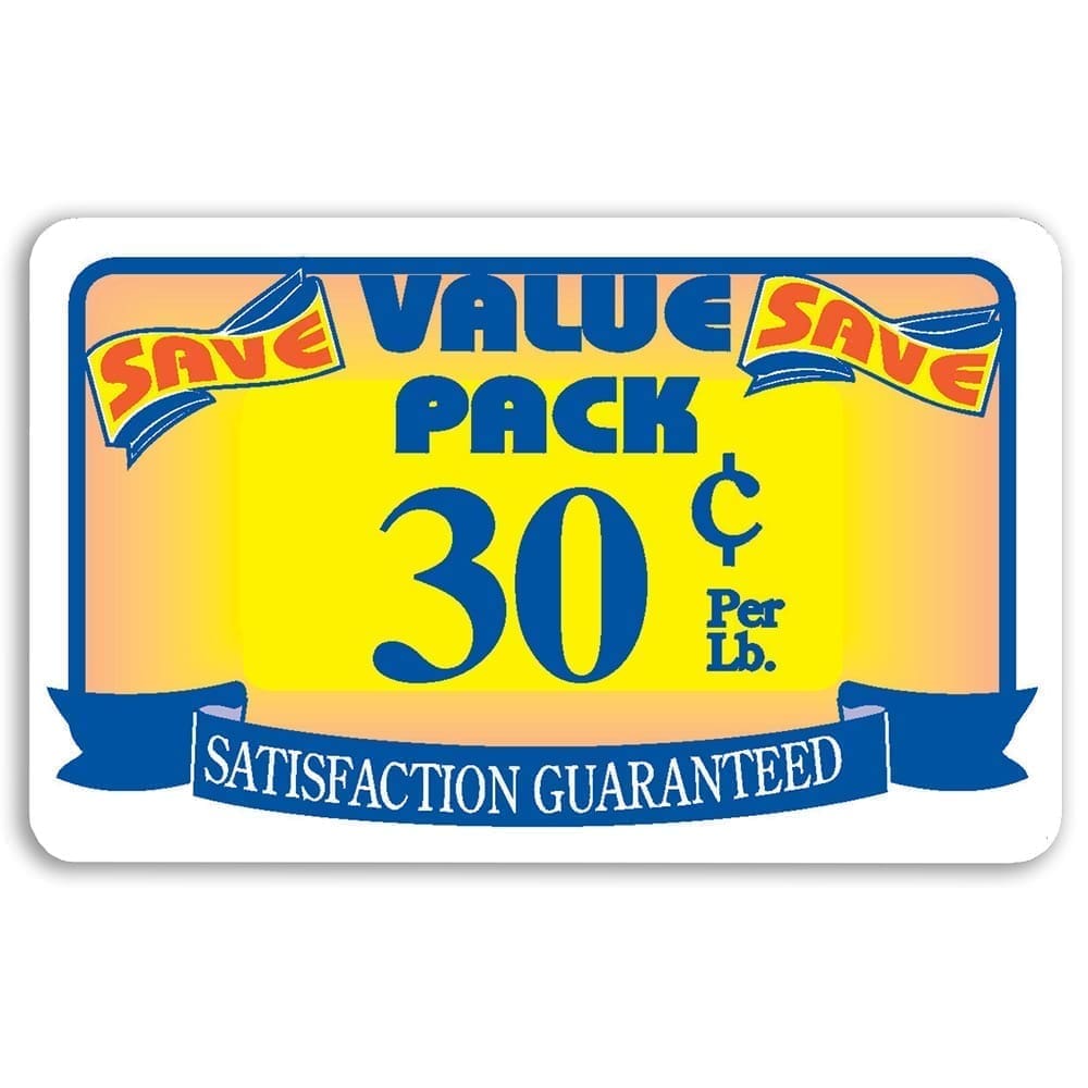The clear message “Value Pack Save 30 Cents Per Lb” effectively communicates a specific discount to your customers, highlighting the cost savings per pound.